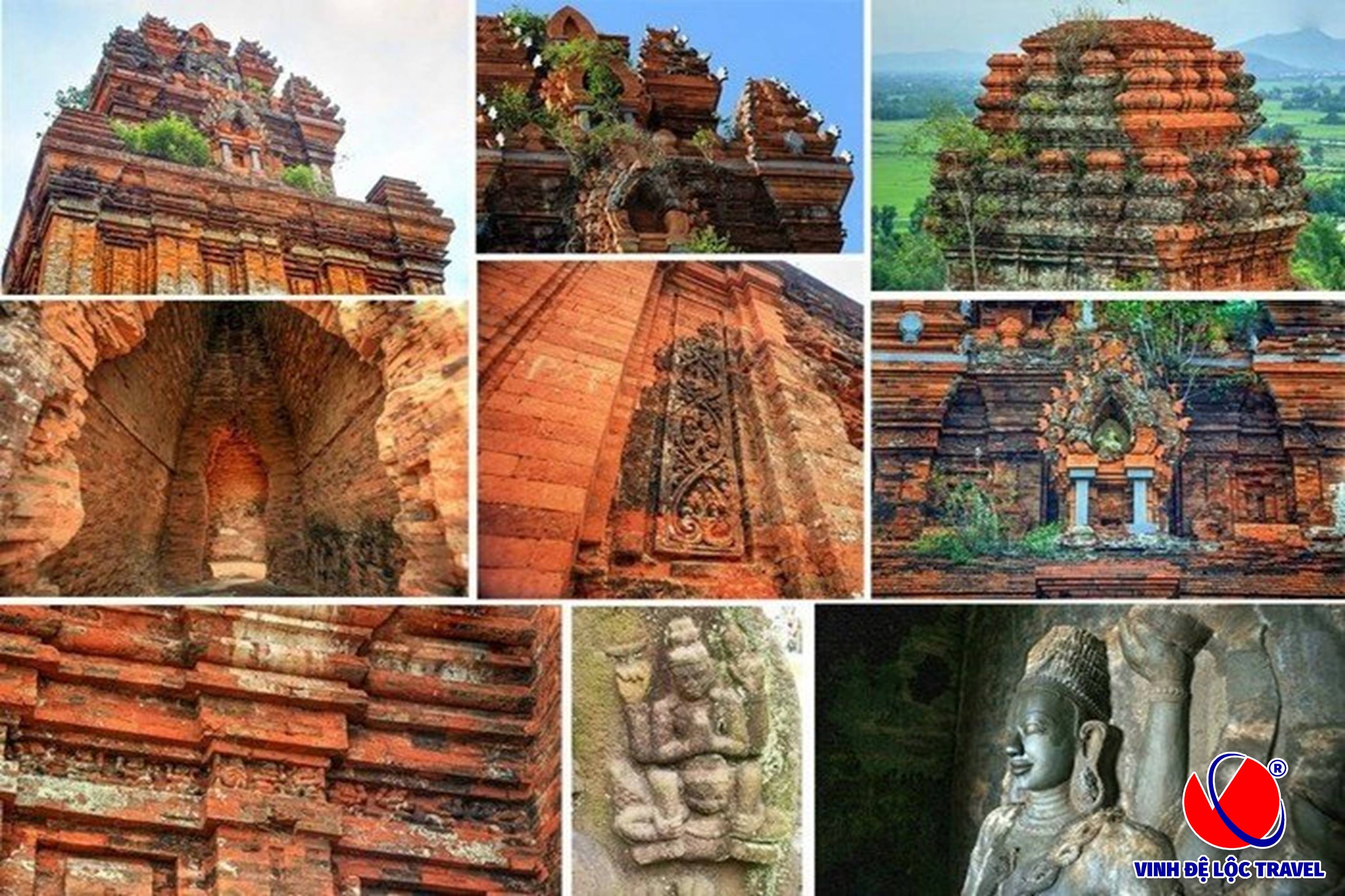 Mặt bằng tháp đa số là hình vuông có không gian bên trong chật hẹp thường có cửa duy nhất mở về hướng Đông (hướng mặt trời mọc), trần tháp được cấu tạo vòm cuốn, trong lòng tháp đặt một bệ thờ thần bằng đá. Điều đặc biệt là cho tháp Chăm trở thành một trong những công trình kiến trúc tiêu biểu là nghệ thuật chạm khắc tinh xảo và ấn tượng. Những hình hoa lá, chim muông, vuc nữ, thần thánh được đẽo gọt, chạm trổ công phu trên mặt tường ngoài của tháp.